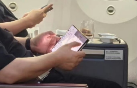 目前,余承东在机舱内操作三折叠屏的图片和视频已在网络广泛传开。照片显示,余承东手持一台三折叠屏新机,这台设备明显比目前的大折叠手机显示面积要大不少,但是从纵横比来看,又不是平板电脑的比例,而且在左手边的那块屏幕的顶部居中还有明显的前摄挖孔,并且屏幕整体上还能隐约看到有两条平均分布的暗痕,屏幕中显示的是疑似微信App的界面,左侧屏幕是好友列表,右侧是对话框,貌似正在浏览网页内容,右手边的保护壳内似乎还隐藏了手写笔。